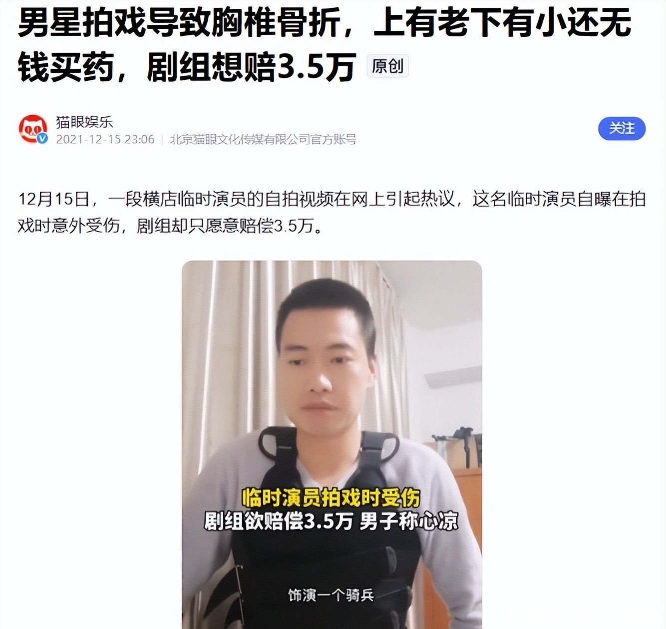 男星拍戏导致胸椎骨折,上有老下有小还无钱买药,剧组想赔3.5万.猫眼娱乐.2021-12-15