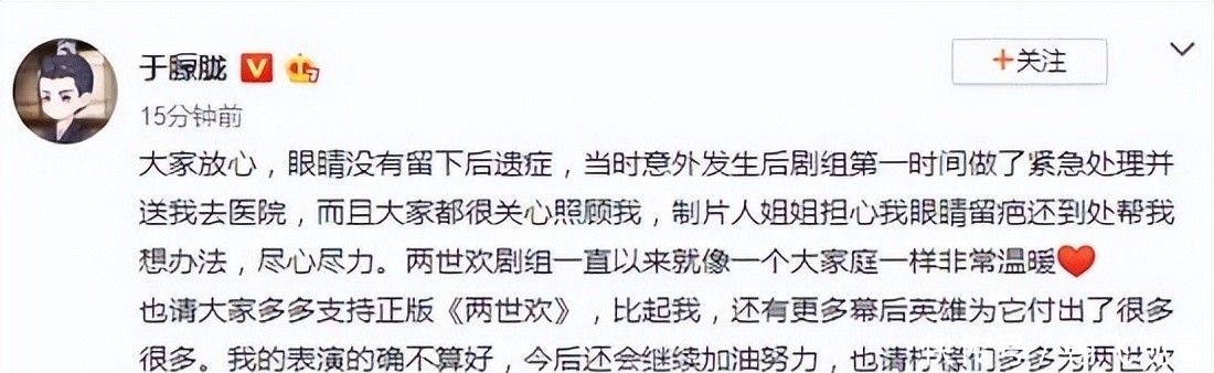 于朦胧在拍摄《两世欢》时,一场持剑对战戏出现严重失误。